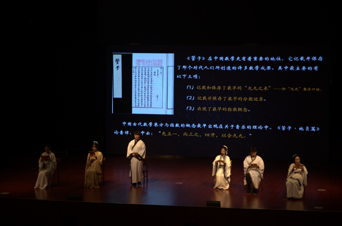 话剧《徽注的世界》由“中学生的思想镜像”与“徽注的世界”两条脉络构成,两条故事线互为对偶,相互补充,将中国古代数学家刘徽的数学思想呈现给大众。演出现场,主创们的精心构思和演员们精湛的表演,在现实与虚幻的转换中带领观众一同前往刘徽《九章算术注》的世界,以精彩的演出致敬中国古典数学的主要奠基人刘徽。